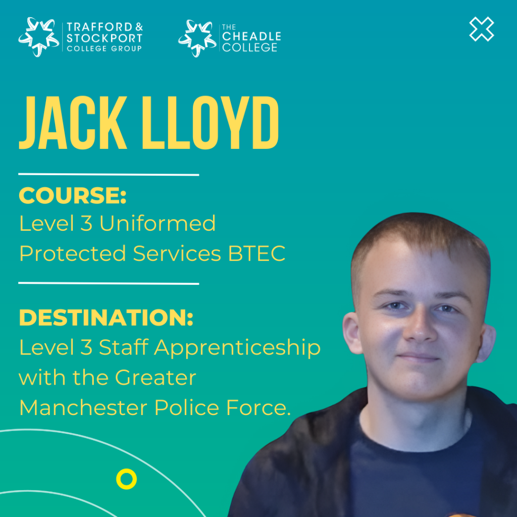 Having now successfully completed his Level 3 Uniformed Protected Services BTEC with Merits, at Cheadle College, Jack is delighted to have secured a Level 3 Apprenticeship with the Greater Manchester Police Force.