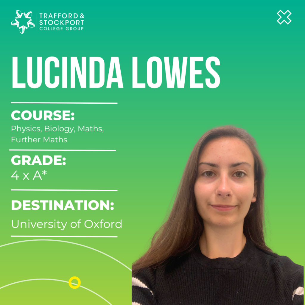 One of the Group’s outstanding academic achievers is Lucinda Lowes, who received four A* grades in Physics, Biology, Maths and Further Maths, at Marple Sixth Form College, securing her place at the University of Oxford to study Physics: a four-year course with integrated Masters.