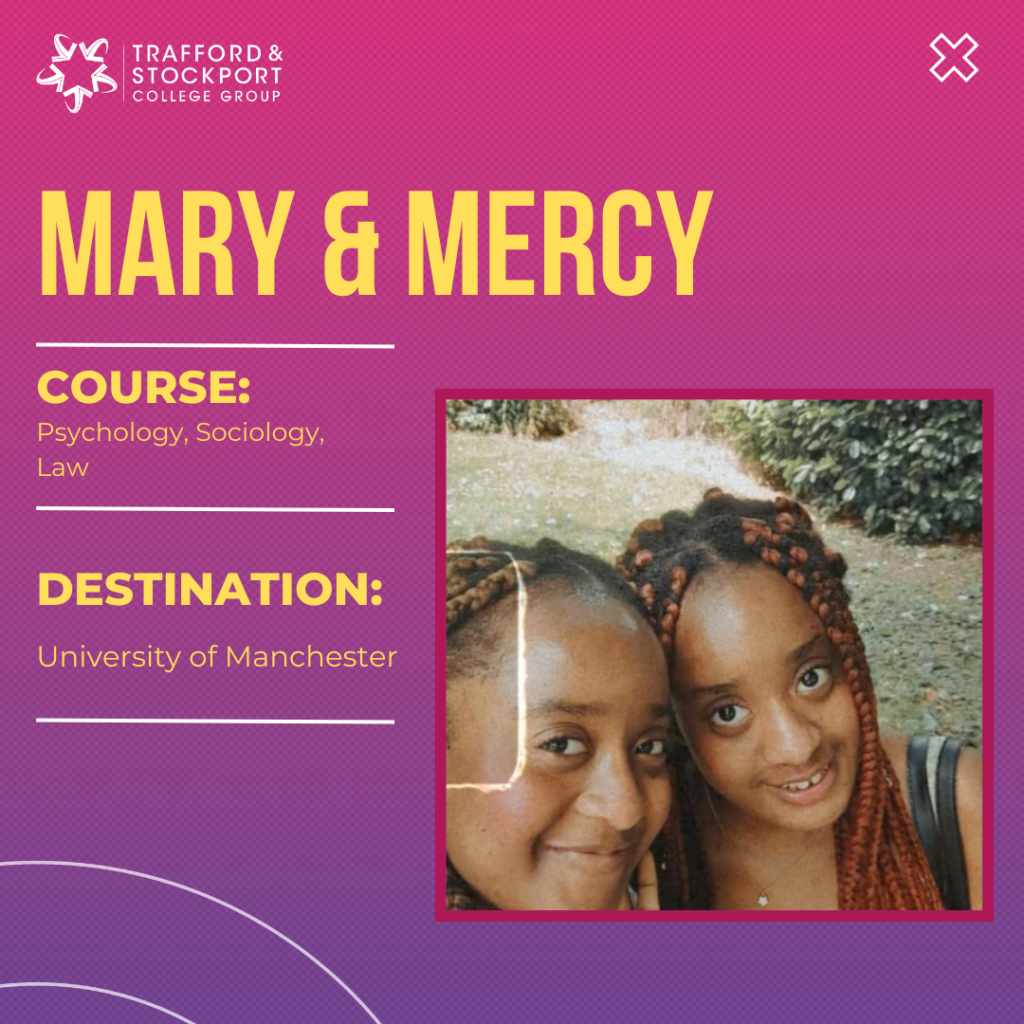 Twins Mary and Mercy Adeniran are both celebrating successful results in Psychology, Sociology and Law (BCC and BBB respectively) at Trafford College, enabling them to go on to the University of Manchester to study Adult Nursing together.